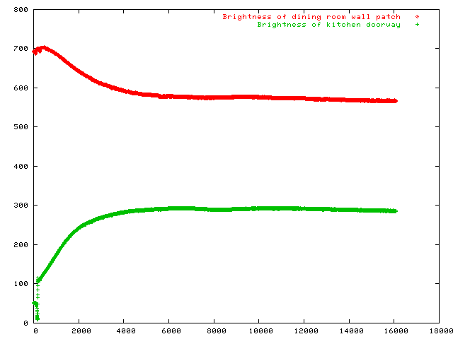 The glitch at the start of the graph is because I had to actually walk in front of the camera to flick the switch, skewing the average brightness of the picture while I was in shot. Unfortunate but necessary, in the absence of a cloak of invisibility.