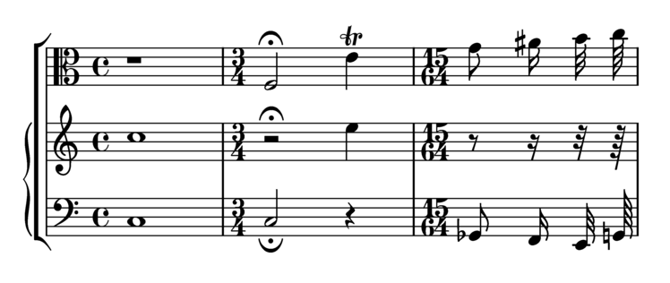First one is standard Lilypond; second one is mine. Things I specifically disliked about LP and prefer about mine include the treble clef (LP's is absurdly tall by the standards of most others, the curved line down the middle makes it look as if it's leaning backwards, and a couple of parts are rather unevenly curved); the trill (LP's is unpleasantly ornate, mine is more in the style I was used to from music I actually played); the time signature digits (IMO much more readable if they're small enough not to collide with the outer stave lines, though actually making them miss at both ends turned out to take some cheating!); the sharp (LP's is too wide and also too slanted for my taste); the fermata (mine looks like an arc of a circle whereas LP's non-vertical ends make it look oddly parabolic); the quaver tails (some differences between the down and up tails are a good thing, but I think LP takes it a bit far). And if you look very closely, LP's minim head has a knobbly outline, but it isn't really clear at this resolution.